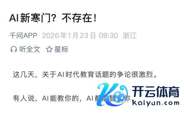1月23日,千问官方呈报“AI寒门”论,称“AI新寒门不存在” (千问公众号标题截图)这缘故于1月21日千问掀翻“孩子到底能不可用AI”的教化大商议。本事,戴建业、“水哥”王昱珩、六神磊磊、沈奕斐、储殷等教化大咖舌战AI时期下的教化,其中,AI时期的教化是否进一步导致阶级分化体育游戏app平台,激发较大存眷。有家长在千问官方账号下留言体育游戏app平台,“看到了‘AI新寒门’这个词,初看挺扎心的,但思了下又以为有真理。何如办?”对AI时期的教化,抒发出深深焦灼。 (网友在千问挑剔区的留言)为此