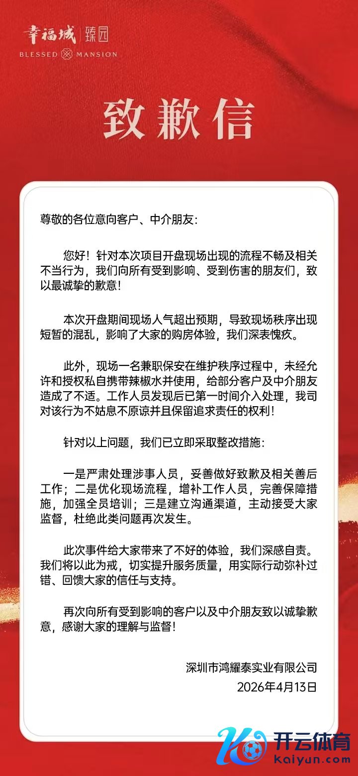 深圳进深 严明会 4月13日ky体育官网登录入口网页版,深圳龙华的幸福城臻园加推3栋住宅。据悉,从昨晚运转,就已有购房者提前十几小时在技俩门口占位,列队抢房。 今天一大早开盘,技俩营销中心透澈被挤爆,现场东谈主潮涌动、水泄欠亨。 技俩安保东谈主员为了“守护步骤”,竟公然向购房者喷辣椒水,激发一派芜乱。 随后,幸福城臻园在官微发布致歉信,称本次开盘期间现场东谈主气超出预期,导致现场步骤出现顷然的芜乱,影响了寰球的购房体验,深表傀怍。 此外,现场别称兼职保何在惊羡步骤过程中,未经允许和授权背地佩戴